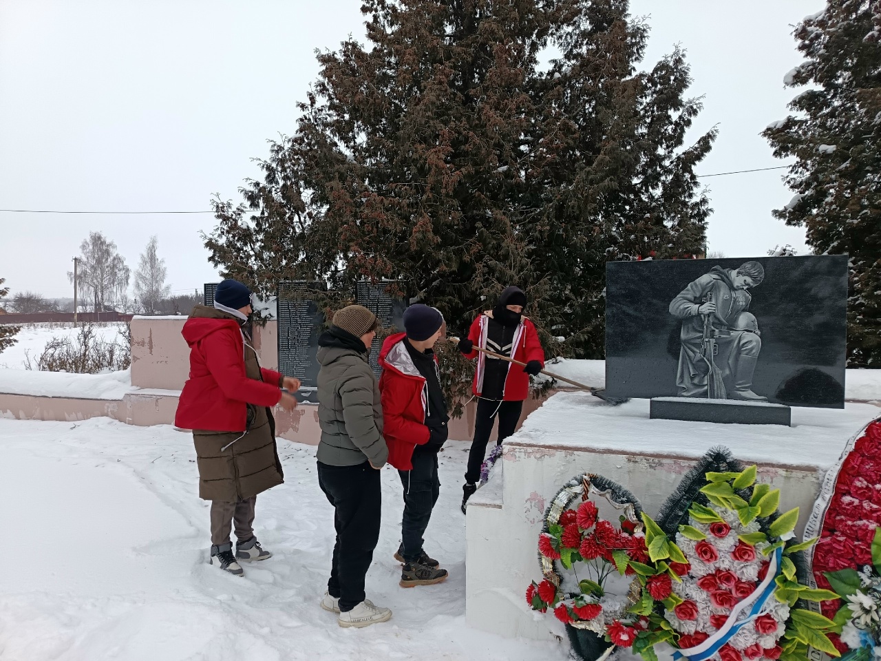 Юнармейцы-волонтёры Двориковской школы активно поддержали акцию «Патруль памяти», организовав уборку снега у мемориала, посвящённого героям Великой Отечественной войны.