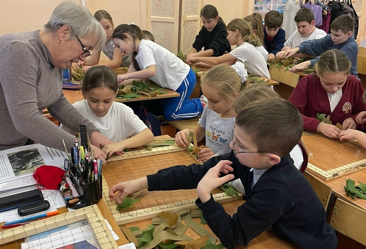 Учащиеся Одоевской средней школы имени А.Д. Виноградова прошли мастер-класс по плетению нашлемников. Дети познакомились с маскировкой, которая спасает жизнь защитникам нашей Родины в зоне СВО.